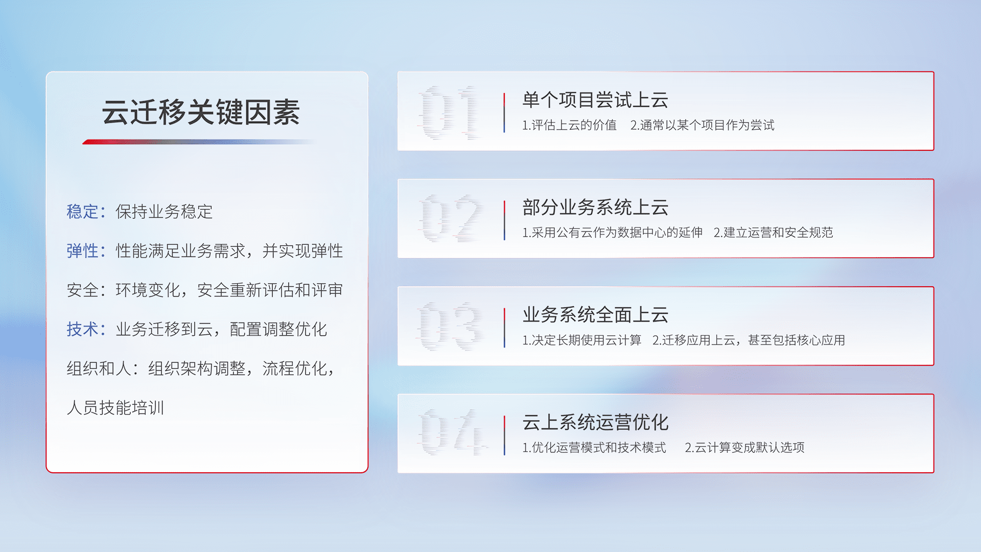 结合实际业务,,,,从规划设计、、、云平台选型、、、云原生改造、、、数据迁移、、、集成交付,,,迁移全过程为客户识别最佳上云路径,,,做好风险识别管理,,设计网络架构、、身份权限、、、安全审计合规、、操作审计、、日志审计、、、监控告警策略、、、多站点容灾设计等,,,,对云上基础设施进行整体规划,,,提升IT治理水平,,,以满足弹性、、、、高可用、、、、高性能的需求。。。。